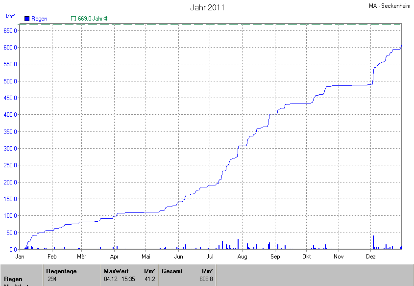 Die gesamte Regenmenge lag bei 608.8l/m² ( 91.0%) und war damit um -60.2l/m² vom langjährigen Wert entfernt. Niederschlag gab es an 164Tagen. Mehr als 2mm Regen gab es an 73Tagen. Sehr viel Regen mit mehr als 20mm pro Tag gab es an 4Tagen.