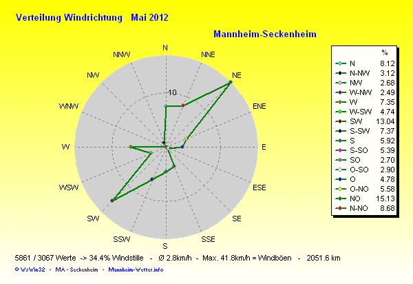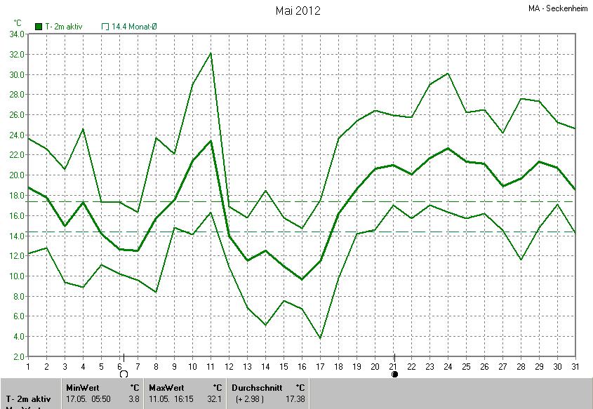 Der wärmste Tag war der 11.05.2012 um 16:15 mit 32.1°C. Am kältesten war es mit 3.8°C am 17.05.2012 um 05:50.