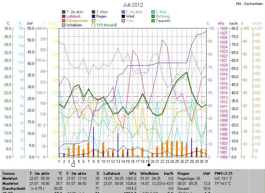 Der wärmste Tag war der 27.07.2012 um 16:00 mit 35.7°C. Am kältesten war es mit 9.4°C am 22.07.2012 um 05:35.