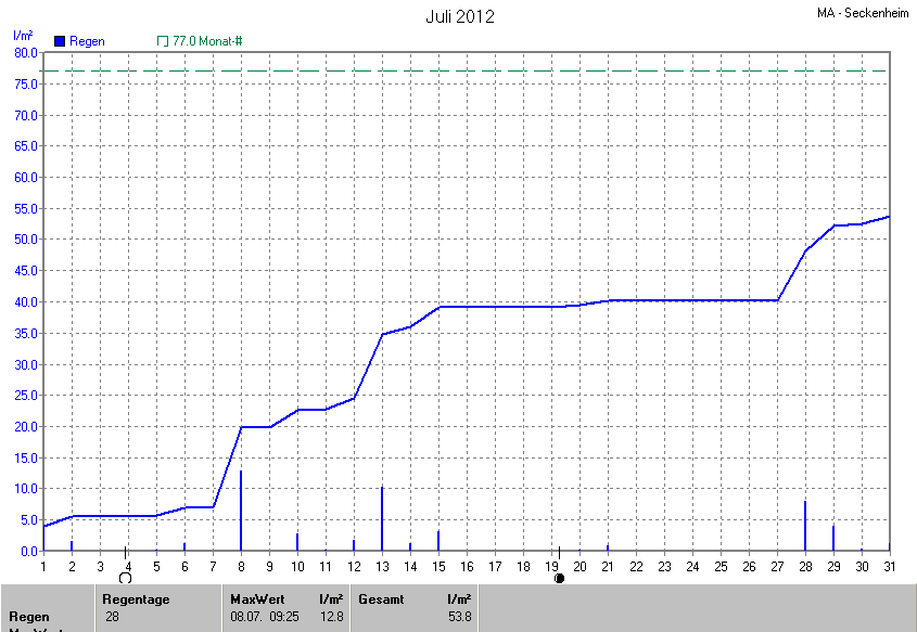Die gesamte Regenmenge lag bei 53.8l/m² (entspricht: 69.9%) und war damit um -23.2l/m² vom langjährigen Wert entfernt. Niederschlag gab es an 17Tagen. Mehr als 2mm Regen gab es an 7Tagen. Sehr viel Regen mit mehr als 20mm pro Tag gab es an 0Tagen.