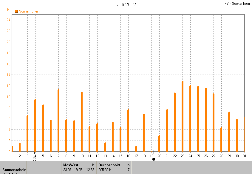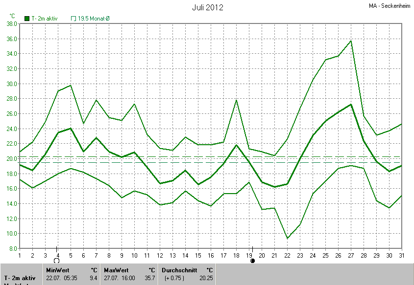 Die Durchschnittstemperatur für den Monat Juli 2012 lag bei 20.25°C. Die Abweichung vom langjährigen Mittel war +0.75°C.