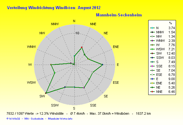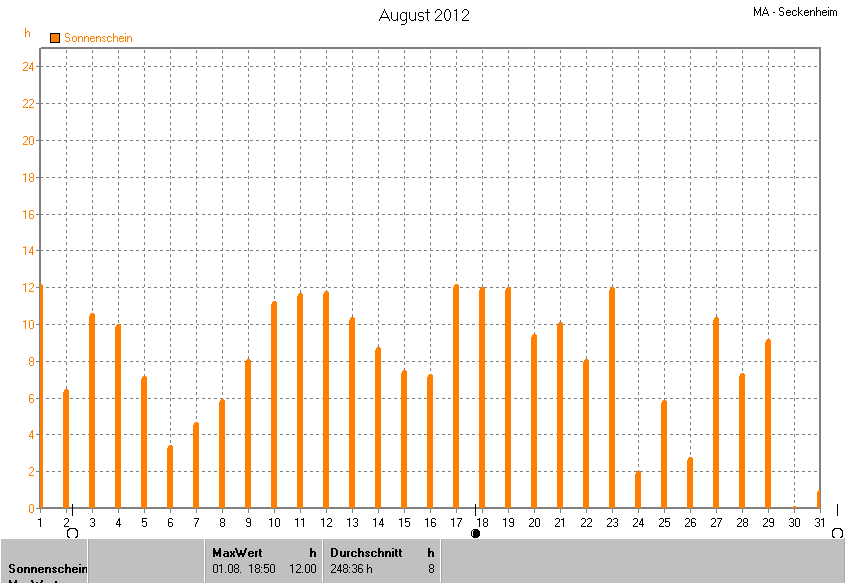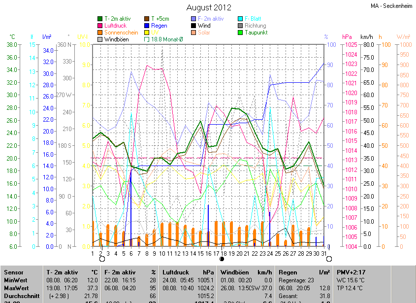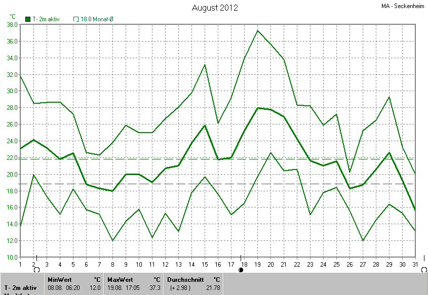 Der wärmste Tag war der 19.08.2012 um 17:05 mit 37.3°C. Am kältesten war es mit 12.0°C am 08.08.2012 um 06:20.