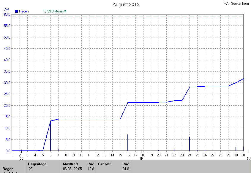Dargestellt wird die grafische Übersicht für den Niederschlag. Zu sehen sind immer die täglichen Niederschlagsmengen (von 0-24 Uhr) und in der ansteigenden Linie die Summe aller Niederschläge: