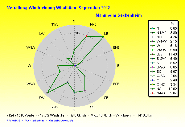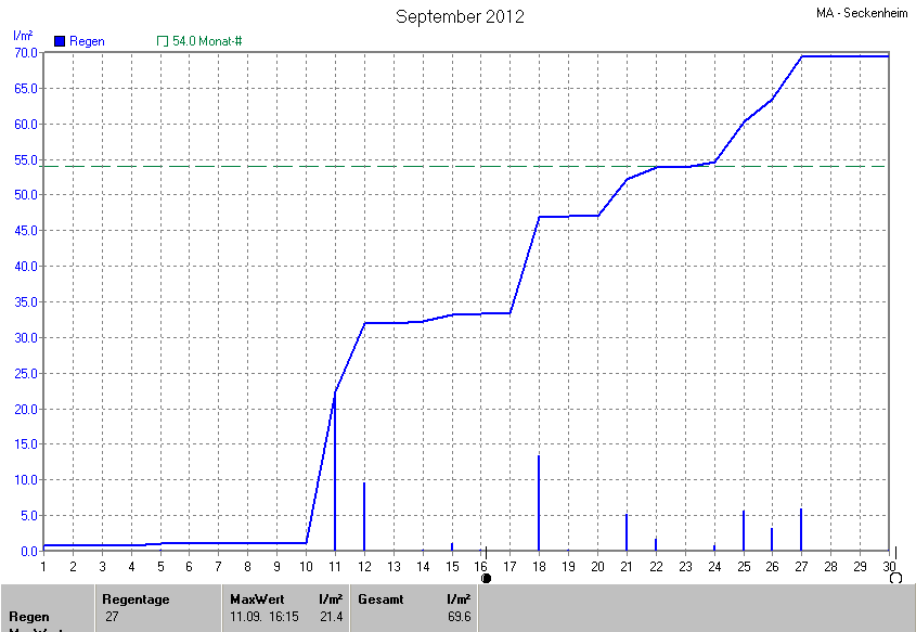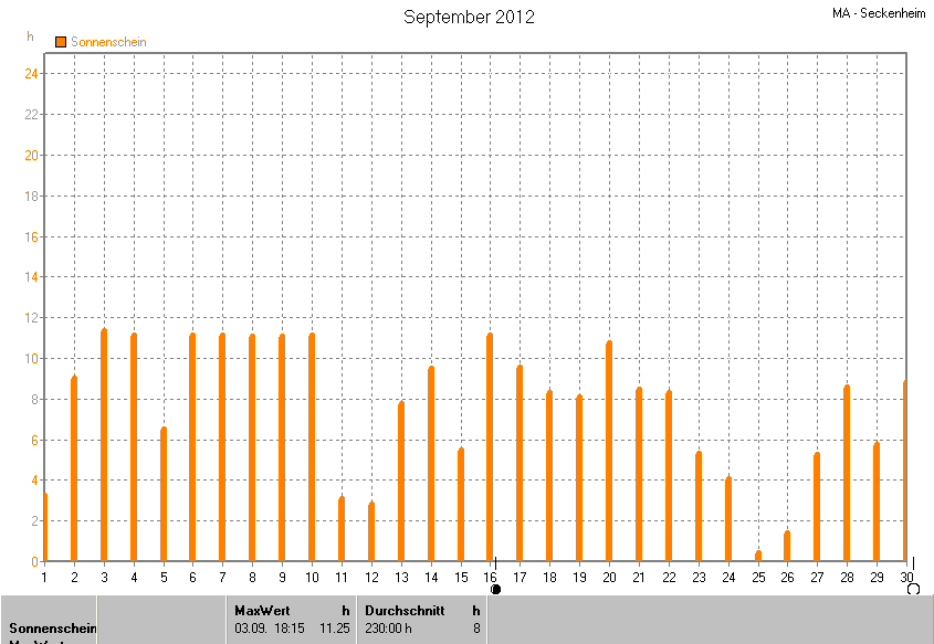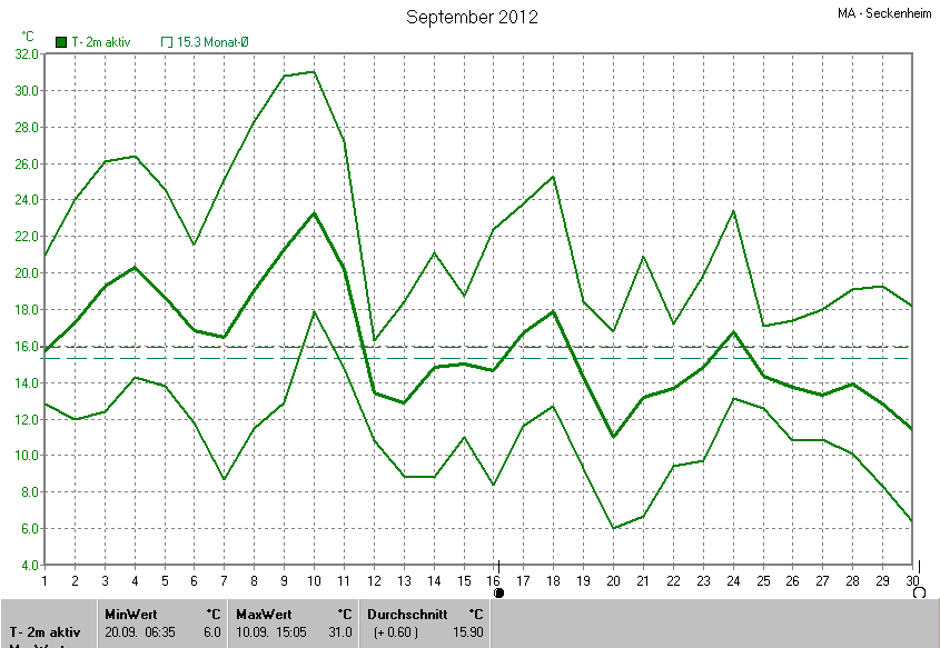 Der wärmste Tag war der 10.09.2012 um 15:05 mit 31.0°C. Am kältesten war es mit 6.0°C am 20.09.2012 um 06:35.