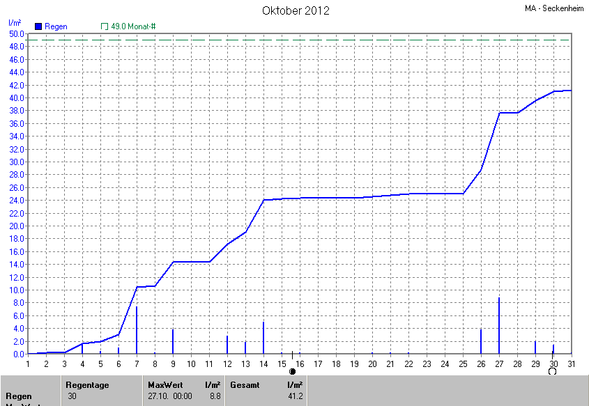 Die Durchschnittstemperatur für den Monat Oktober 2012 lag bei 10.38°C. Die Abweichung vom langjährigen Mittel war -0.02°C.