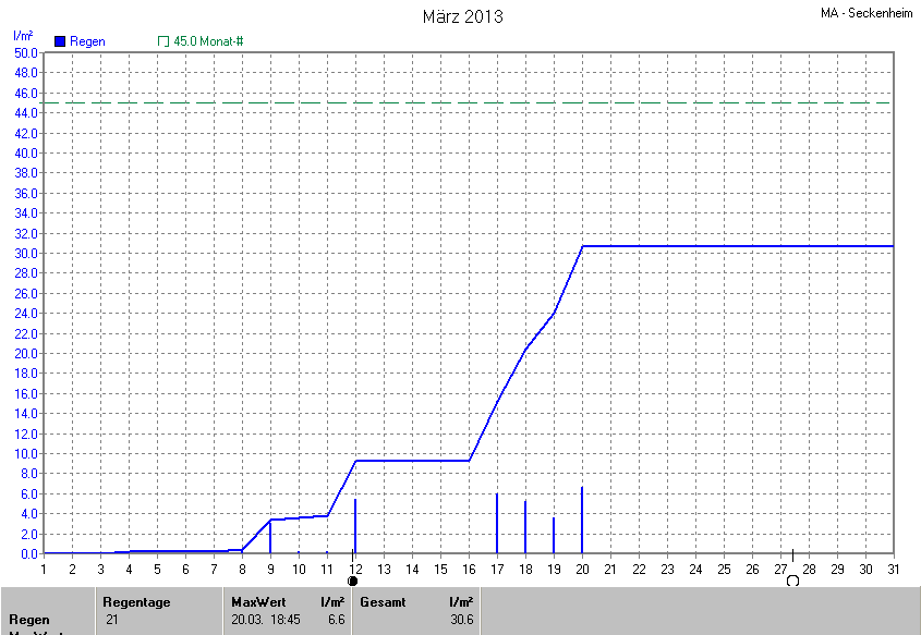 Dargestellt wird die grafische Übersicht für den Niederschlag. Zu sehen sind immer die täglichen Niederschlagsmengen (von 0-24 Uhr) und in der ansteigenden Linie die Summe aller Niederschläge: