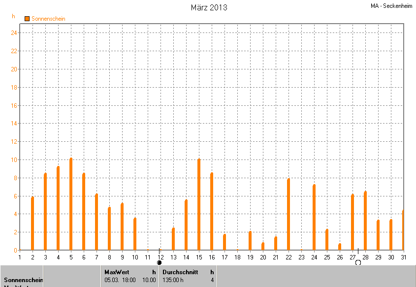 Dargestellt wird die grafische Übersicht für die Sonnenscheinzeit. Zu sehen sind immer die täglichen Sonnenstunden (von 0-24 Uhr):