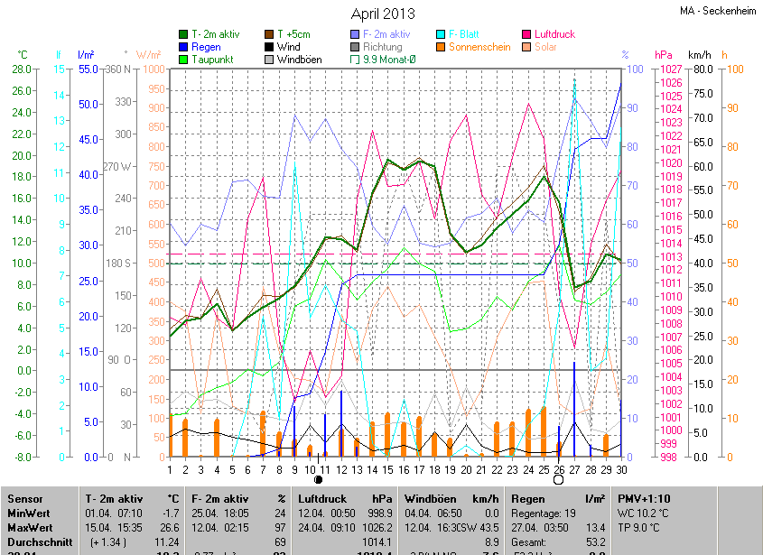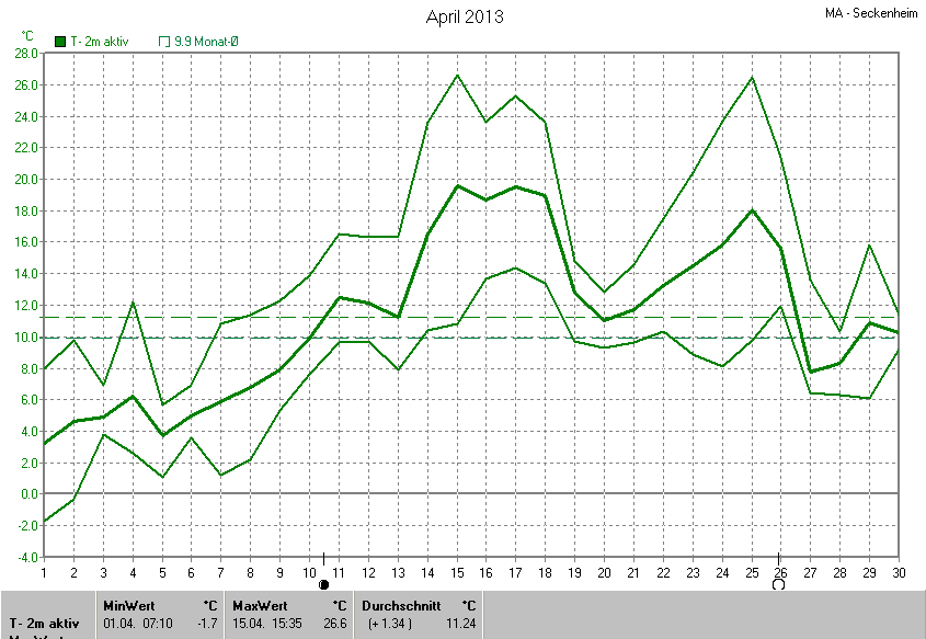 Der wärmste Tag war der 15.04.2013 um 15:35 mit 26.6°C. Am kältesten war es mit -1.7°C am 01.04.2013 um 07:10.