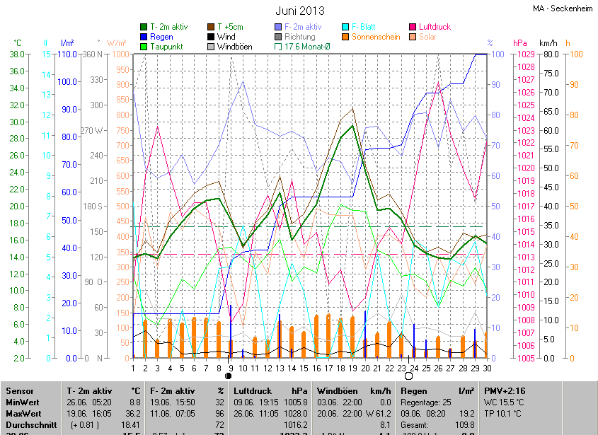 Der wärmste Tag war der 19.06.2013 um 16:05 mit 36.2°C. Am kältesten war es mit 8.8°C am 26.06.2013 um 05:20.