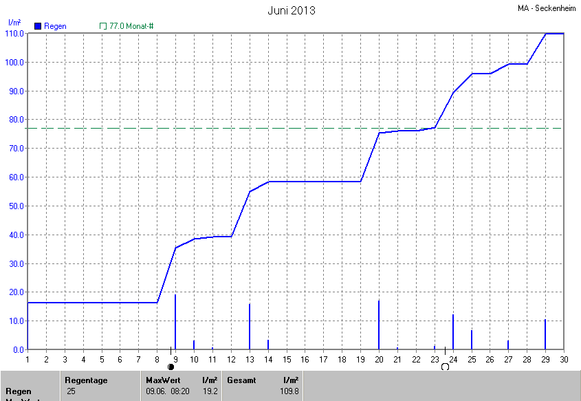Die gesamte Regenmenge lag bei 109.8l/m² (entspricht: 142.6%) und war damit um +32.8l/m² vom langjährigen Wert entfernt. Niederschlag gab es an 13Tagen. Mehr als 2mm Regen gab es an 10Tagen. Sehr viel Regen mit mehr als 20mm pro Tag gab es an 0Tagen.