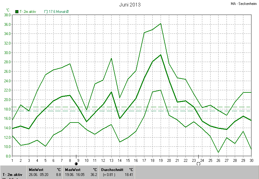 Die Durchschnittstemperatur für den Monat Juni 2013 lag bei 18.41°C. Die Abweichung vom langjährigen Mittel war +0.81°C.