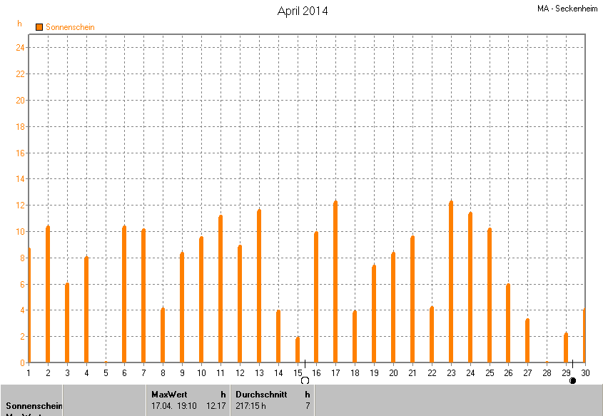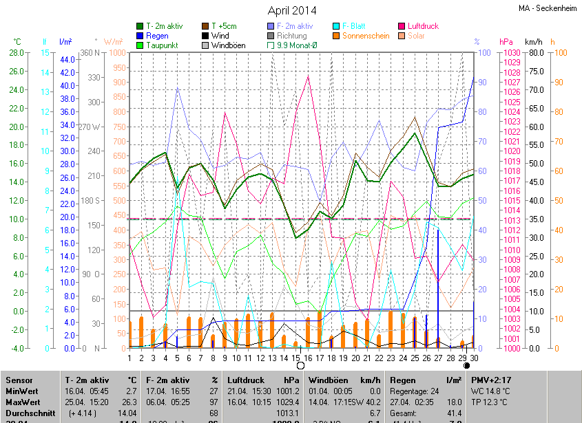 Die Durchschnittstemperatur für den Monat April 2014 lag bei 14.04°C. Die Abweichung vom langjährigen Mittel war +4.14°C.