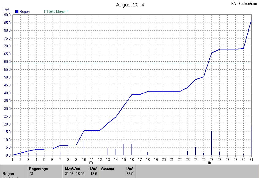 Dargestellt wird die grafische Übersicht für den Niederschlag. Zu sehen sind immer die täglichen Niederschlagsmengen (von 0-24 Uhr) und in der ansteigenden Linie die Summe aller Niederschläge: