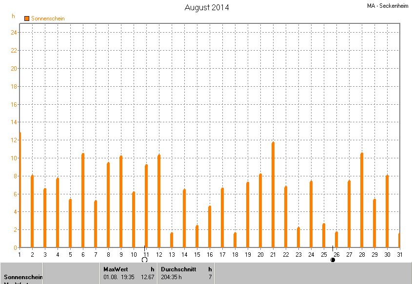 Dargestellt wird die grafische Übersicht für die Sonnenscheinzeit. Zu sehen sind immer die täglichen Sonnenstunden (von 0-24 Uhr):