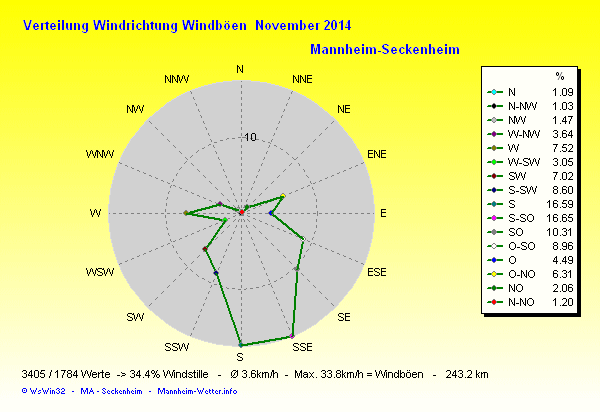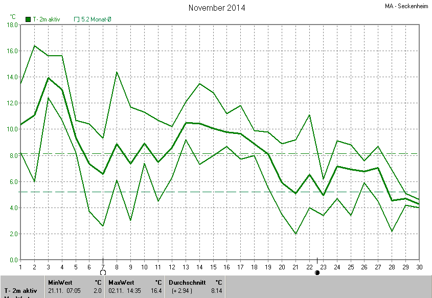 Die Durchschnittstemperatur für den Monat November 2014 lag bei 8.14°C. Die Abweichung vom langjährigen Mittel war +2.94°C.