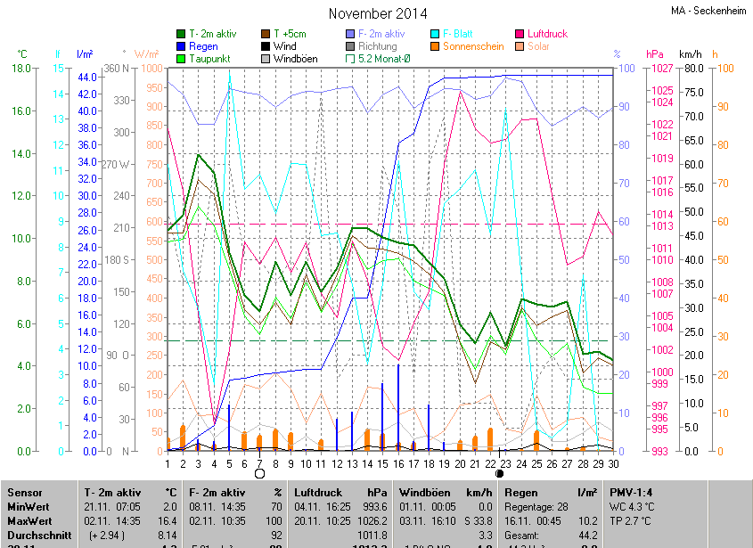Der wärmste Tag war der 02.11.2014 um 14:35 mit 16.4°C. Am kältesten war es mit 2.0°C am 21.11.2014 um 07:05.