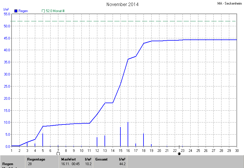 Dargestellt wird die grafische Übersicht für den Niederschlag. Zu sehen sind immer die täglichen Niederschlagsmengen (von 0-24 Uhr) und in der ansteigenden Linie die Summe aller Niederschläge: