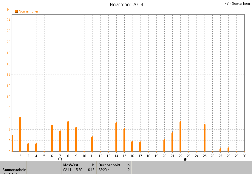 Dargestellt wird die grafische Übersicht für die Sonnenscheinzeit. Zu sehen sind immer die täglichen Sonnenstunden (von 0-24 Uhr):
