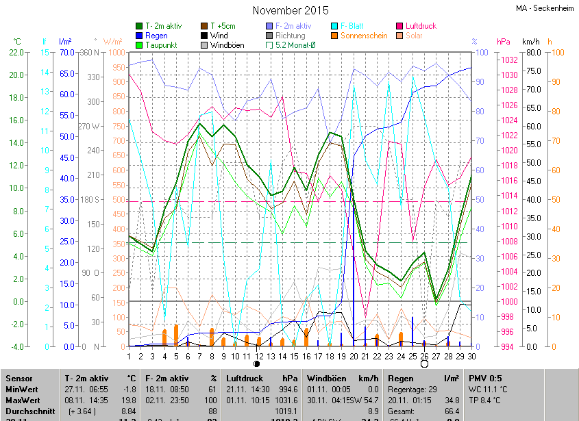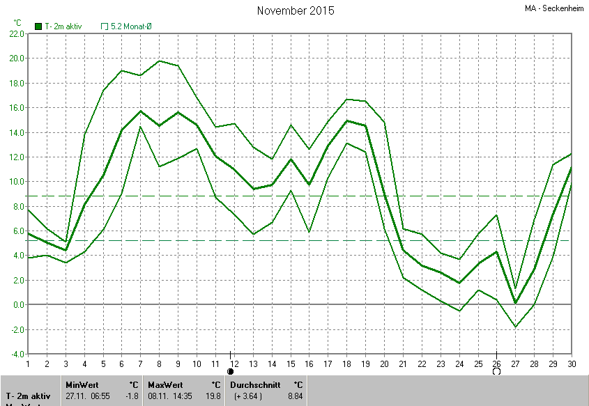 Die Durchschnittstemperatur für den Monat November 2015 lag bei 8.84°C. Die Abweichung vom langjährigen Mittel war +3.64°C.