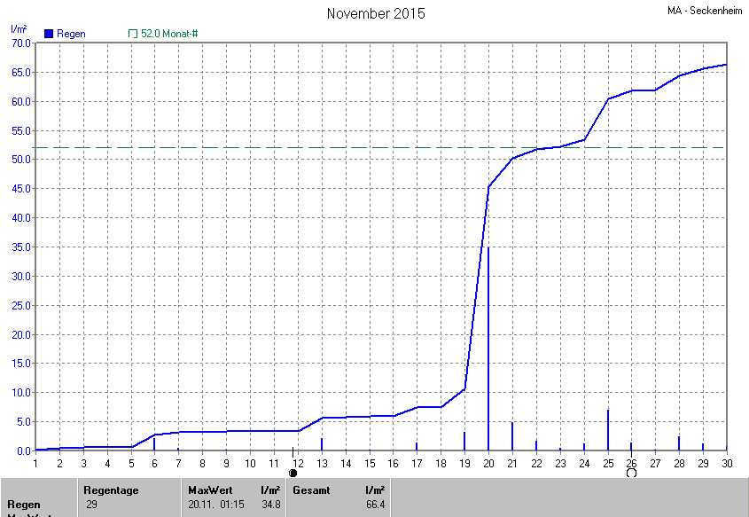 Dargestellt wird die grafische Übersicht für den Niederschlag. Zu sehen sind immer die täglichen Niederschlagsmengen (von 0-24 Uhr) und in der ansteigenden Linie die Summe aller Niederschläge: