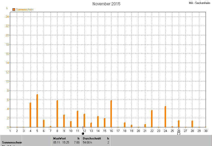 Dargestellt wird die grafische Übersicht für die Sonnenscheinzeit. Zu sehen sind immer die täglichen Sonnenstunden (von 0-24 Uhr):