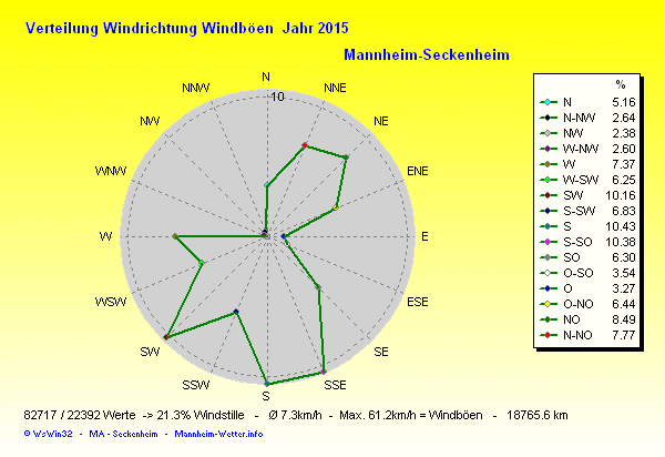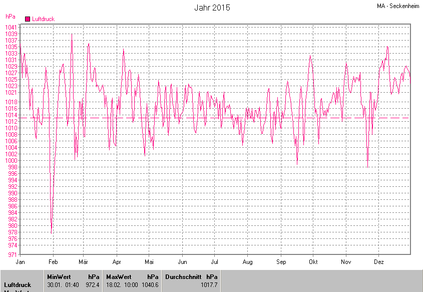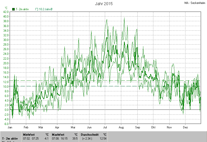 Am wärmsten war es am 07.08.2015 um 16:15 mit 39.5°C. Am kältesten mit -4.1°C am 07.02.2015 um 07:25.