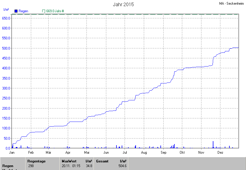 Die gesamte Regenmenge lag bei 504.6l/m² ( 75.4%) und war damit um -164.4l/m² vom langjährigen Wert entfernt. Niederschlag gab es an 164Tagen. Mehr als 2mm Regen gab es an 65Tagen. Sehr viel Regen mit mehr als 20mm pro Tag gab es an 2Tagen.