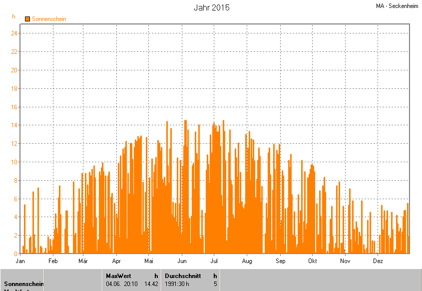 Dargestellt wird die grafische Übersicht für die Sonnenscheinzeit. Zu sehen sind immer die täglichen Zeiten (von 0-24 Uhr):