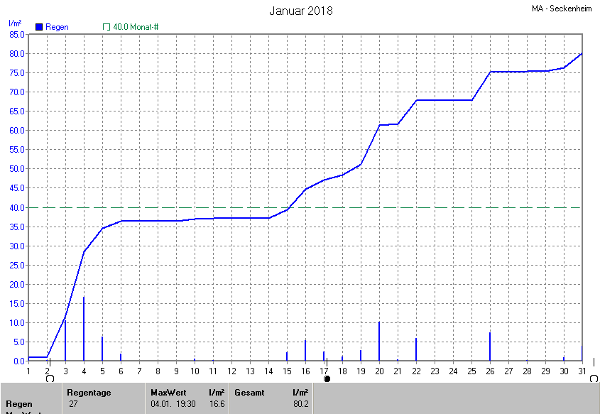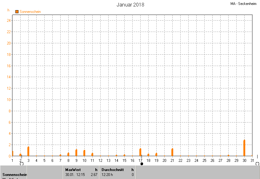 Die Durchschnittstemperatur für den Monat Januar 2018 lag bei 6.98°C. Die Abweichung vom langjährigen Mittel war +5.78°C.