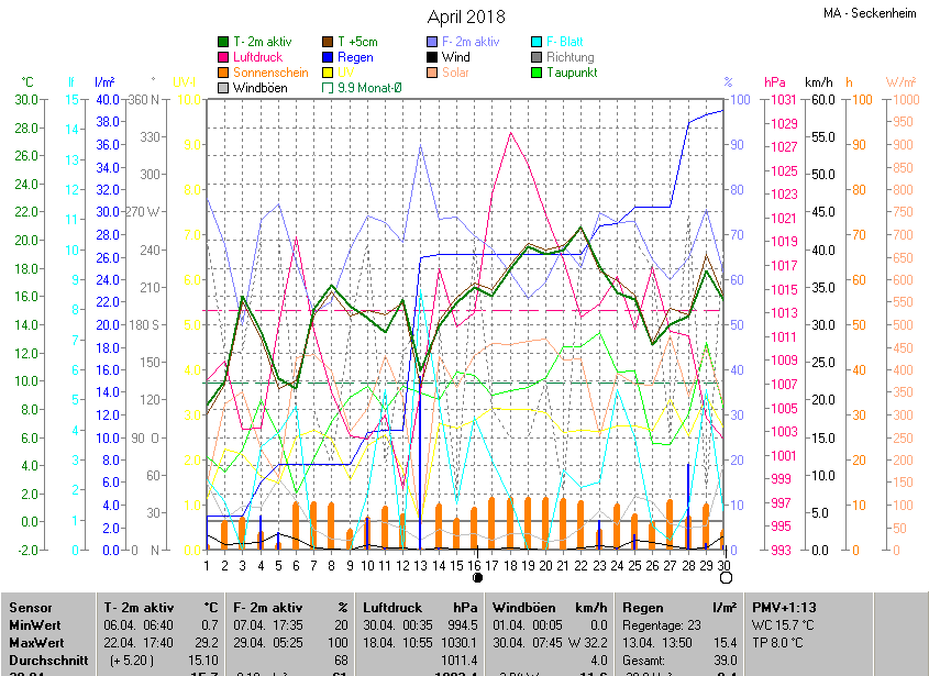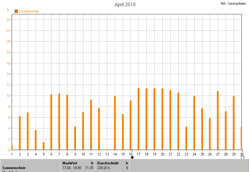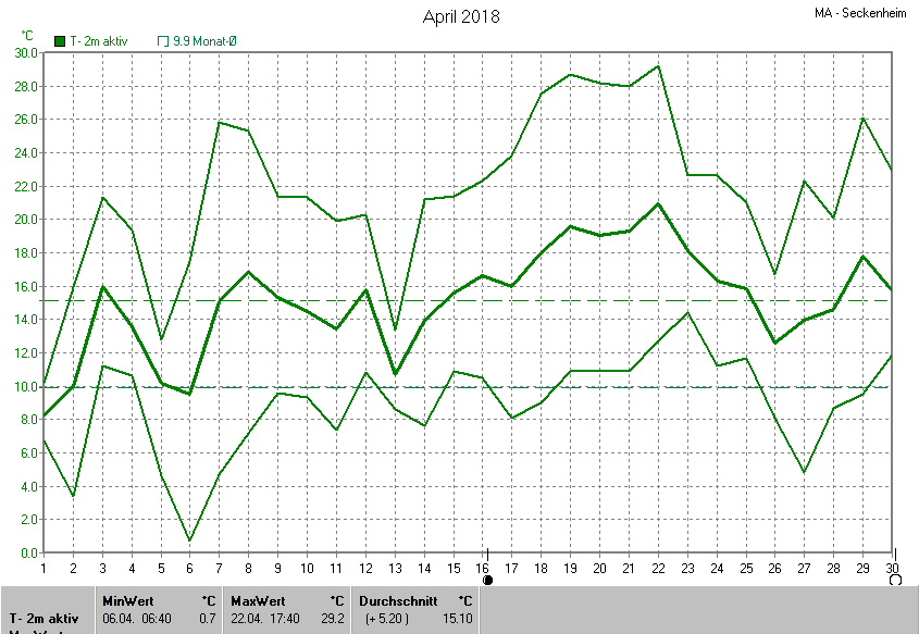 Die Durchschnittstemperatur für den Monat April 2018 lag bei 15.10°C. Die Abweichung vom langjährigen Mittel war +5.20°C.