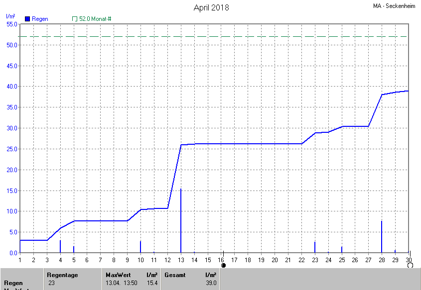 Die gesamte Regenmenge lag bei 39.0l/m² (entspricht: 75.0%) und war damit um -13.0l/m² vom langjährigen Wert entfernt. Niederschlag gab es an 13Tagen. Mehr als 2mm Regen gab es an 6Tagen. Sehr viel Regen mit mehr als 20mm pro Tag gab es an 0Tagen.