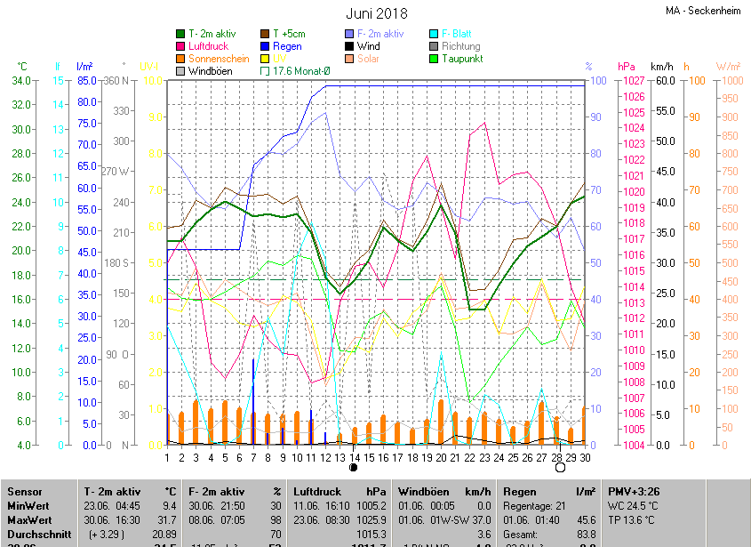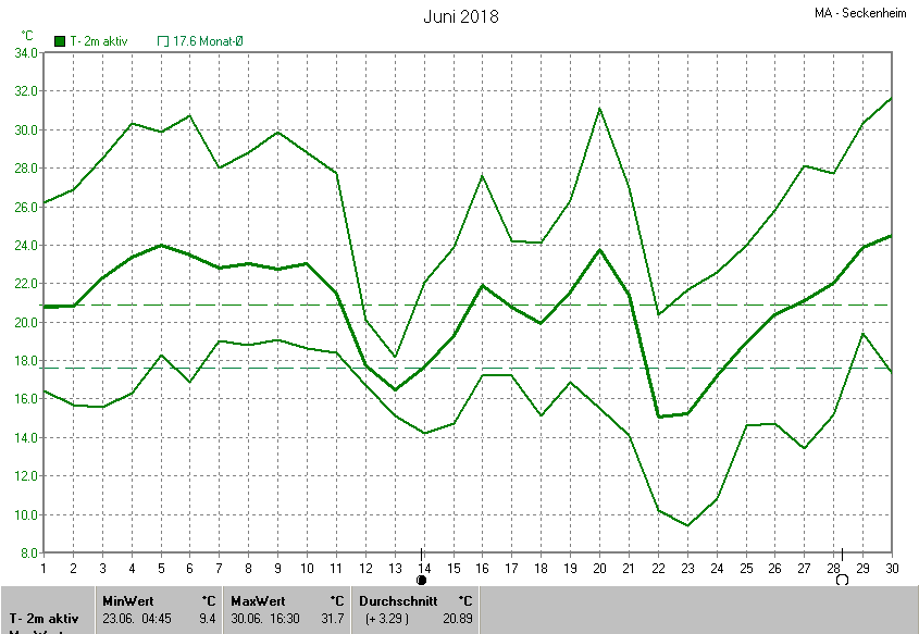 Der wärmste Tag war der 30.06.2018 um 16:30 mit 31.7°C. Am kältesten war es mit 9.4°C am 23.06.2018 um 04:45.