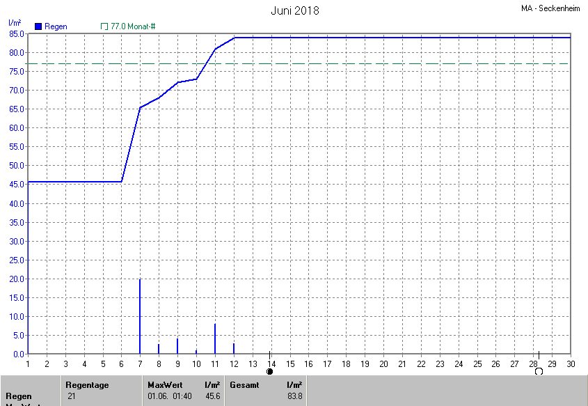 Die gesamte Regenmenge lag bei 83.8l/m² (entspricht: 108.8%) und war damit um +6.8l/m² vom langjährigen Wert entfernt. Niederschlag gab es an 7Tagen. Mehr als 2mm Regen gab es an 6Tagen. Sehr viel Regen mit mehr als 20mm pro Tag gab es an 1Tagen.