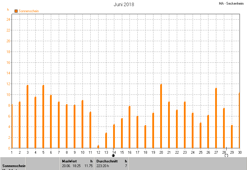 Dargestellt wird die grafische Übersicht für die Sonnenscheinzeit. Zu sehen sind immer die täglichen Sonnenstunden (von 0-24 Uhr):