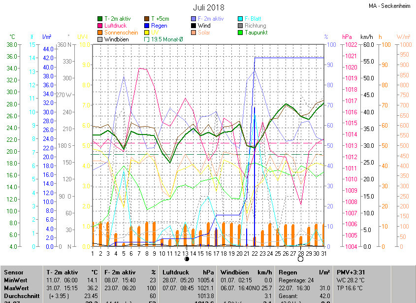 Der wärmste Tag war der 31.07.2018 um 15:15 mit 36.2°C. Am kältesten war es mit 14.1°C am 11.07.2018 um 06:00.