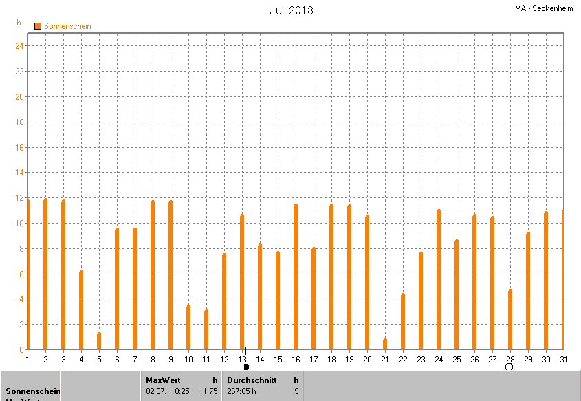 Dargestellt wird die grafische Übersicht für die Sonnenscheinzeit. Zu sehen sind immer die täglichen Sonnenstunden (von 0-24 Uhr):