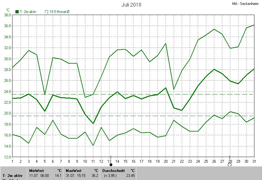 Die Durchschnittstemperatur für den Monat Juli 2018 lag bei 23.45°C. Die Abweichung vom langjährigen Mittel war +3.95°C.