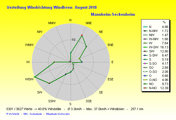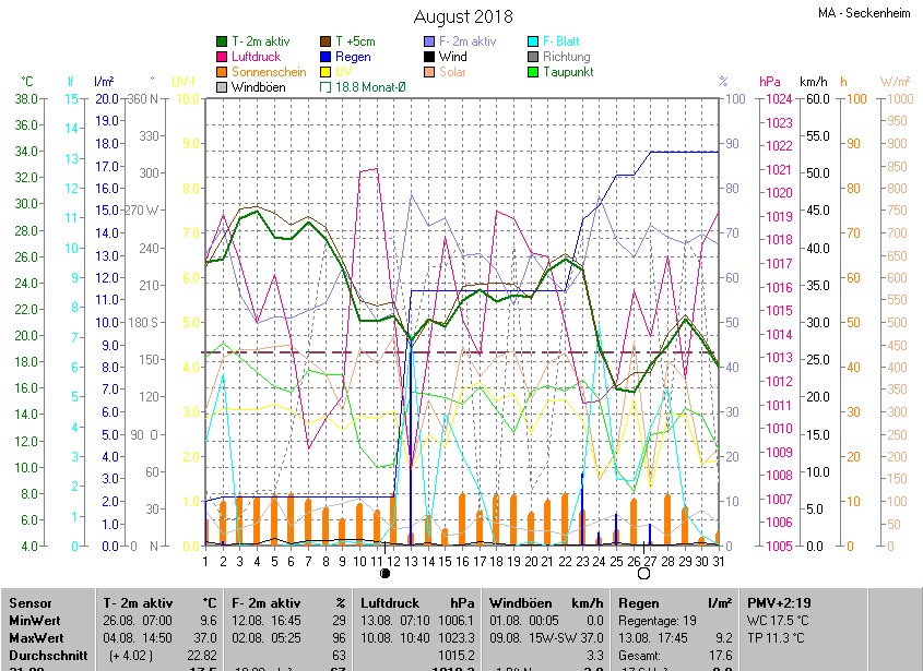 Der wärmste Tag war der 04.08.2018 um 14:50 mit 37.0°C. Am kältesten war es mit 9.6°C am 26.08.2018 um 07:00.