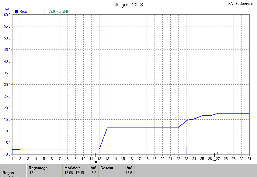 Die gesamte Regenmenge lag bei 15.6l/m² (entspricht: 26.4%) und war damit um -43.4l/m² vom langjährigen Wert entfernt. Niederschlag gab es an 6Tagen. Mehr als 2mm Regen gab es an 2Tagen. Sehr viel Regen mit mehr als 20mm pro Tag gab es an 0Tagen.