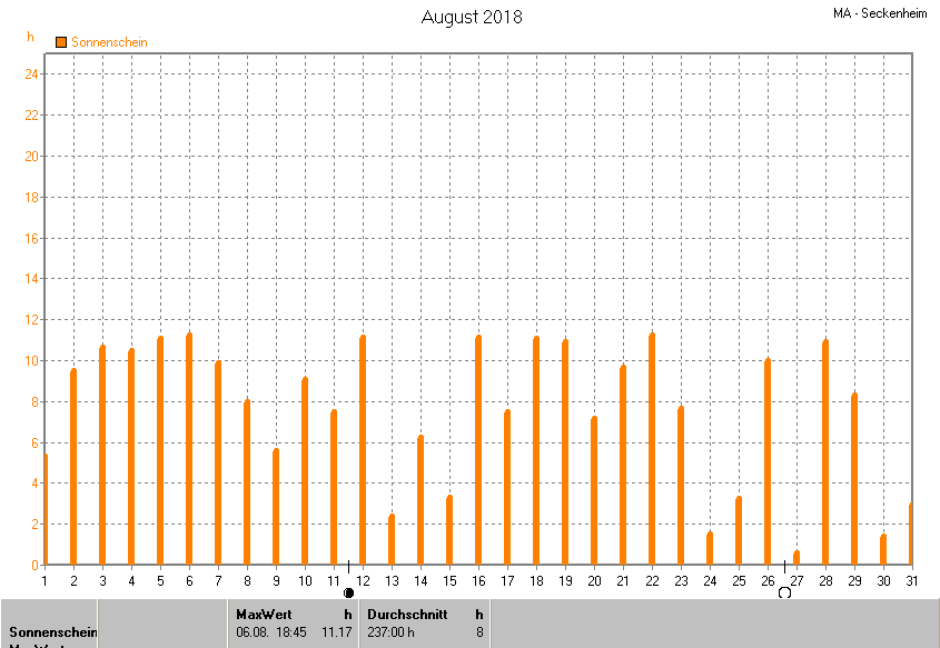 Dargestellt wird die grafische Übersicht für die Sonnenscheinzeit. Zu sehen sind immer die täglichen Sonnenstunden (von 0-24 Uhr):