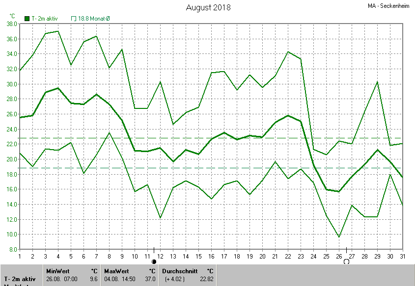 Die Durchschnittstemperatur für den Monat August 2018 lag bei 22.82°C. Die Abweichung vom langjährigen Mittel war +4.02°C.
