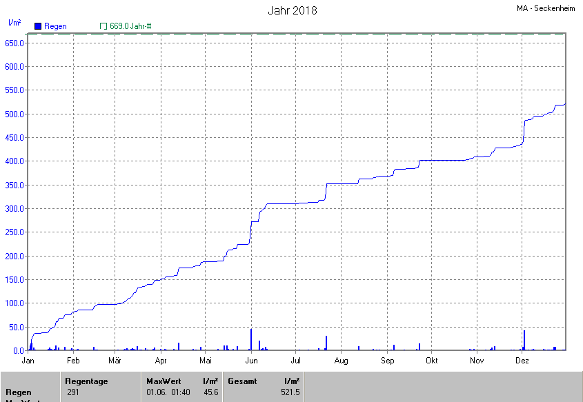 Die gesamte Regenmenge lag bei 521.5l/m² ( 78.0%) und war damit um -147.5l/m² vom langjährigen Wert entfernt. Niederschlag gab es an 148Tagen. Mehr als 2mm Regen gab es an 65Tagen. Sehr viel Regen mit mehr als 20mm pro Tag gab es an 3Tagen.