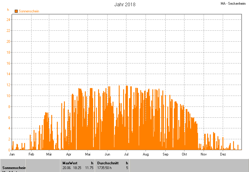 Dargestellt wird die grafische Übersicht für die Sonnenscheinzeit. Zu sehen sind immer die täglichen Zeiten (von 0-24 Uhr):