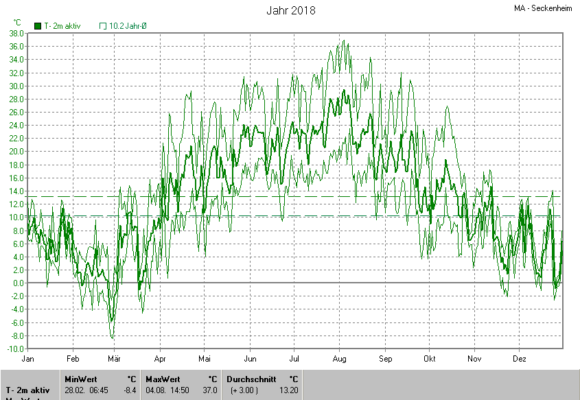 Die Durchschnittstemperatur für das Jahr 2018 lag bei 13.20°C. Die Abweichung vom langjährigen Mittel war +3.00°C.