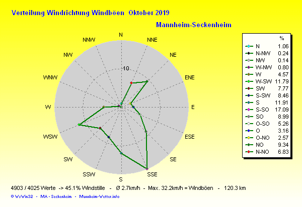 Die Durchschnittstemperatur für den Monat Oktober 2019 lag bei 13.05°C. Die Abweichung vom langjährigen Mittel war +2.65°C.