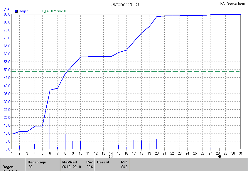 Die gesamte Regenmenge lag bei 84.8l/m² (entspricht: 173.1%) und war damit um +35.8l/m² vom langjährigen Wert entfernt. Niederschlag gab es an 21Tagen. Mehr als 2mm Regen gab es an 11Tagen. Sehr viel Regen mit mehr als 20mm pro Tag gab es an 1Tagen.