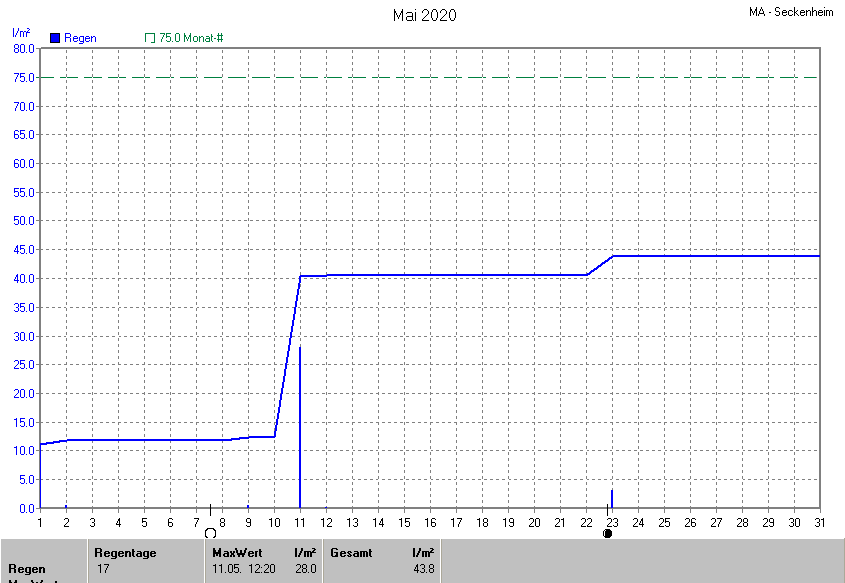 Die gesamte Regenmenge lag bei 43.8l/m² (entspricht: 58.4%) und war damit um -31.2l/m² vom langjährigen Wert entfernt. Niederschlag gab es an 6Tagen. Mehr als 2mm Regen gab es an 3Tagen. Sehr viel Regen mit mehr als 20mm pro Tag gab es an 1Tagen.