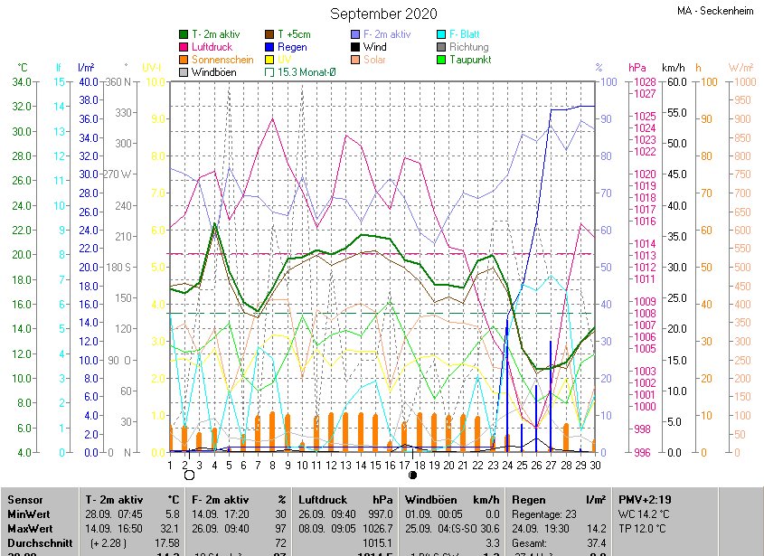 Der wärmste Tag war der 14.09.2020 um 16:50 mit 32.1°C. Am kältesten war es mit 5.8°C am 28.09.2020 um 07:45.