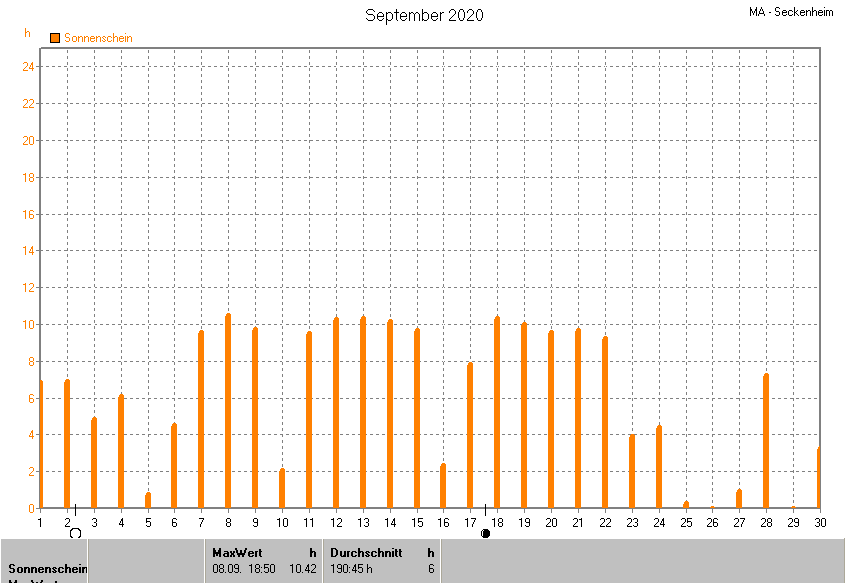 Dargestellt wird die grafische Übersicht für die Sonnenscheinzeit. Zu sehen sind immer die täglichen Sonnenstunden (von 0-24 Uhr):