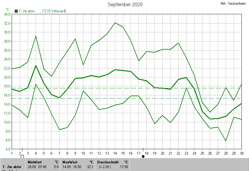 Die Durchschnittstemperatur für den Monat September 2020 lag bei 17.58°C. Die Abweichung vom langjährigen Mittel war +2.28°C.